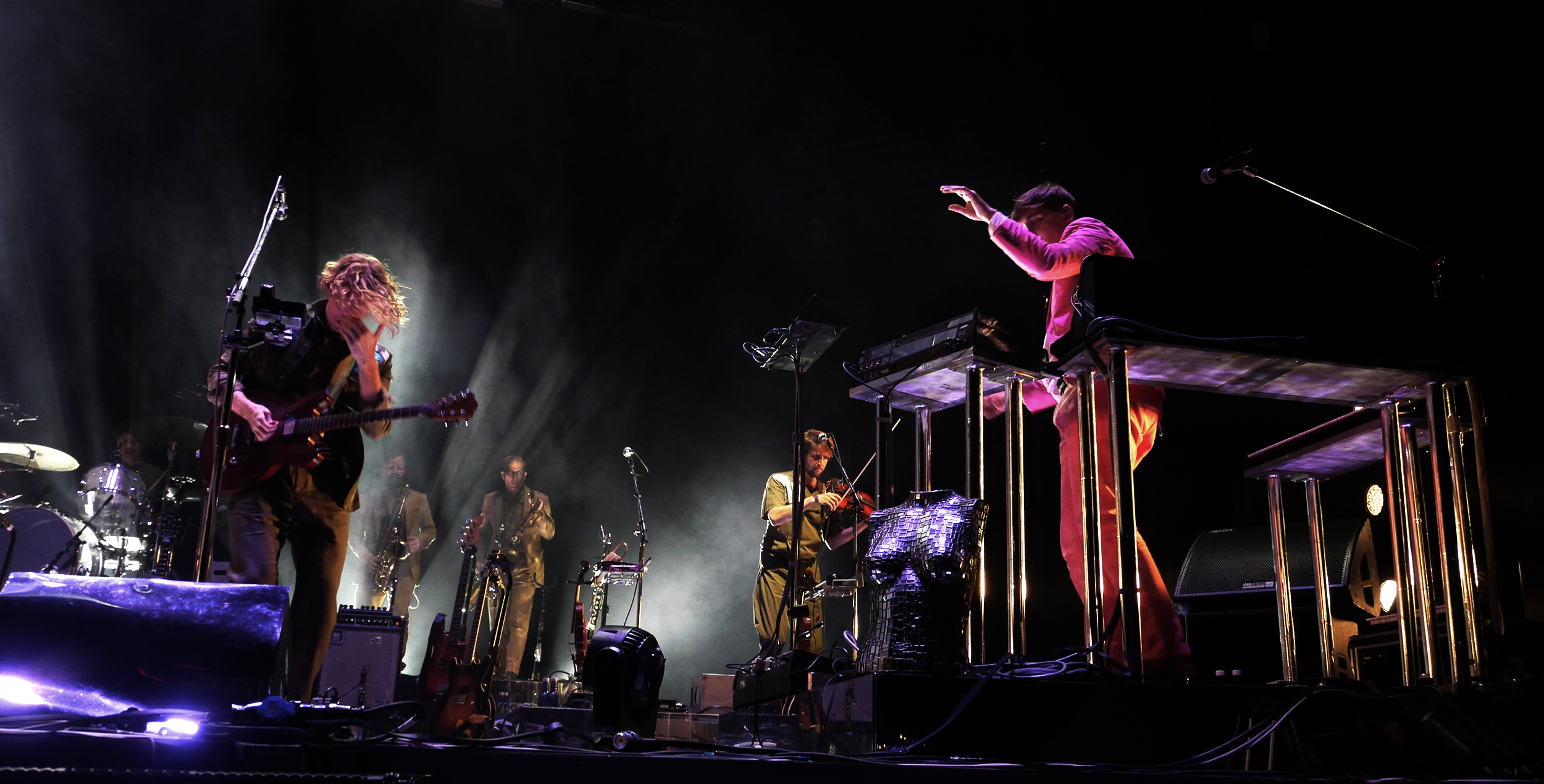 Mais l’événement phare du BBK Live 2016 était surtout la venue quasi-exclusive d’Arcade Fire. Délaissant leur set de la précédente tournée, les Montréalais ont été fidèles à eux-mêmes avec une véritable performance scénique, nous faisant même oublier le son médiocre. Le groupe reste indéniablement l’un des meilleurs en live avec un Win Butler charismatique au possible. Des moments presque magiques lors de « My Body is a Cage », « Afterlife » ou « Rebellion (Lies) » que le public a reprit en chœur espérant même un retour sur scène une fois les lumières éteintes. Les autres temps forts étaient bien évidemment les Pixies (avec un Franck Black aux allures de VRP mais toujours aussi rock sans avoir à jouer au rocker), Tame Impala sur fond de coucher de soleil qui s’est montré bien plus convaincant que sur sa dernière tournée, Foals qui n’a pas fait un seul faux pas comme à son habitude et le retour de New Order qui eux aussi, ont marqué plusieurs générations